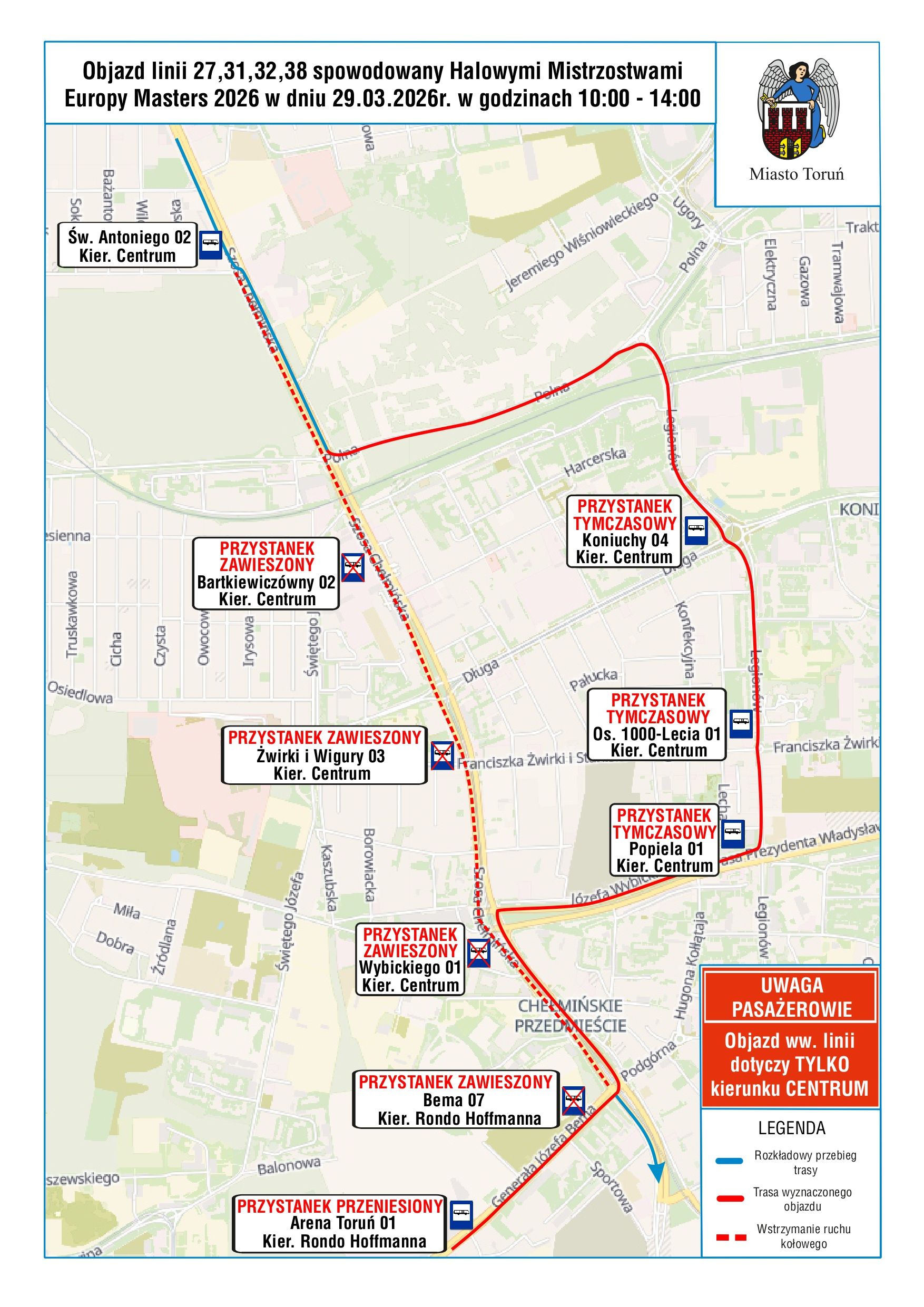 W niedzielę 29 marca br., w czasie Mistrzostw Europy Masters 2026, inaczej będzie funkcjonowała toruńska komunikacja miejska.